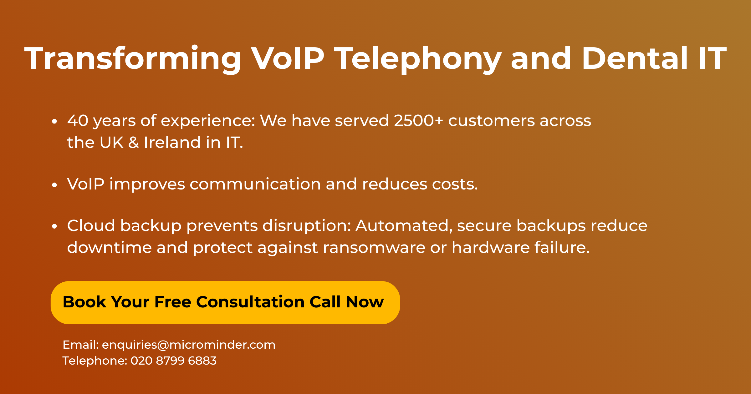 Traditional phone systems are rapidly becoming outdated, especially with the upcoming PSTN switch-off in 2027. Dental practices that still rely on analogue lines risk being left behind. VoIP (Voice over Internet Protocol) offers a modern, cloud-based alternative that ensures seamless communication across reception, treatment rooms, and even remote staff.