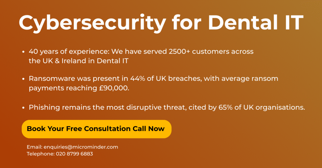 Cybersecurity in Dental IT refers to the protection of digital systems, business & patient data, and operational infrastructure from cyber threats. The risk of data breaches and ransomware attacks have grown significantly in the UK. Cybersecurity ensures compliance with GDPR and CQC and protects patient trust while it keeps practices running smoothly and securely.